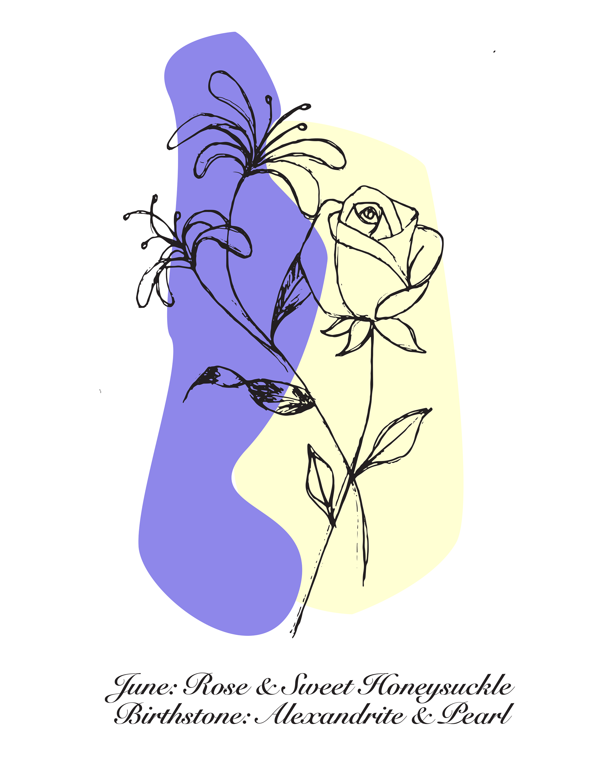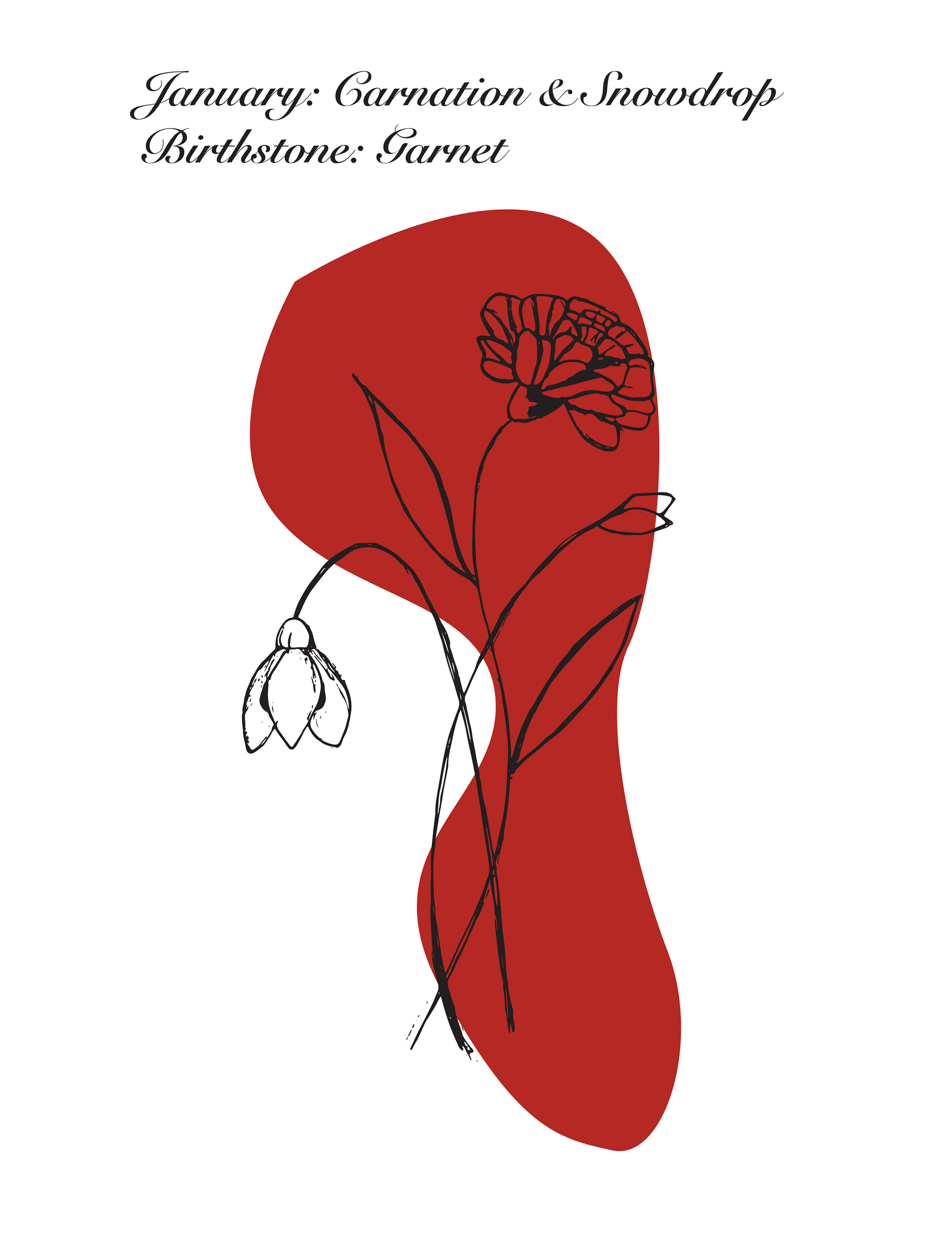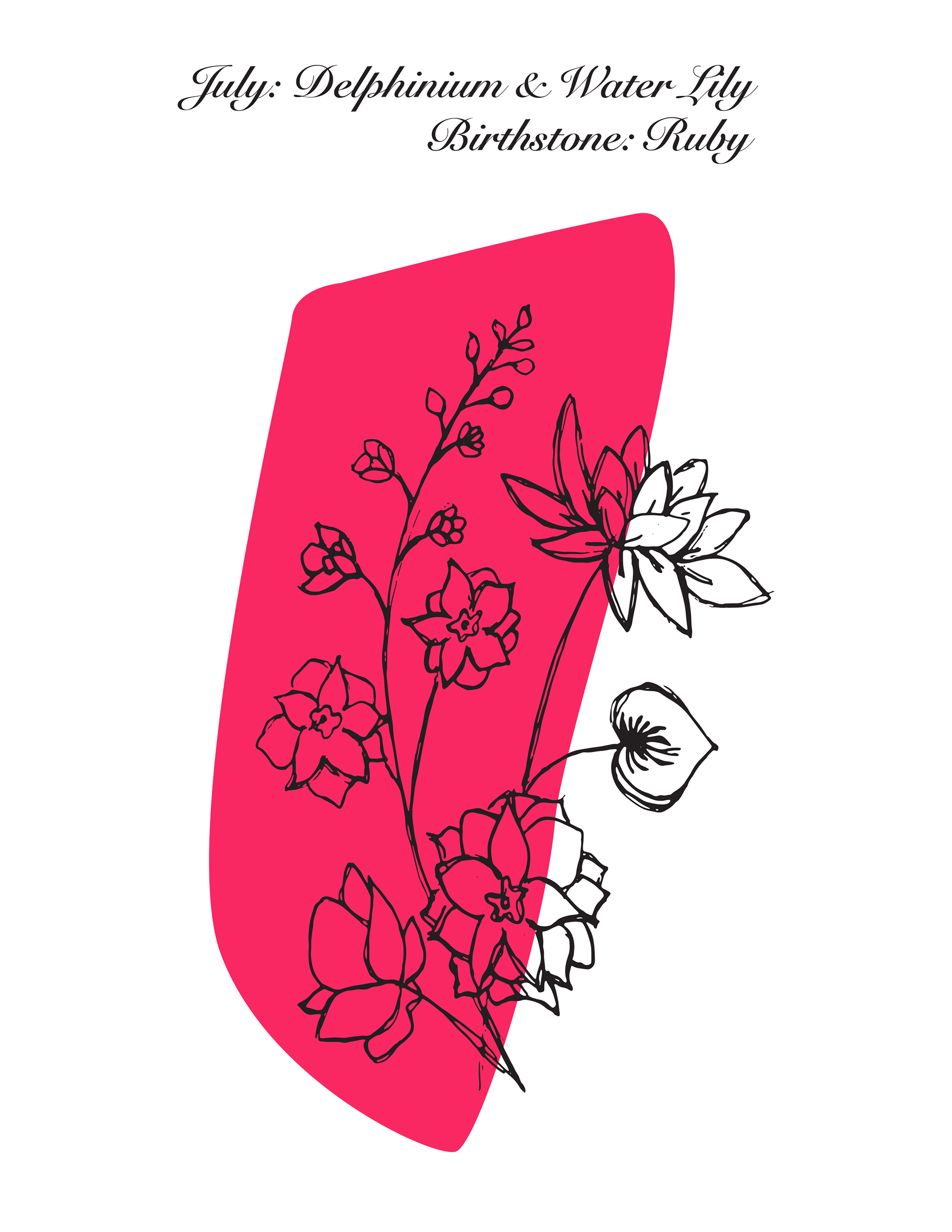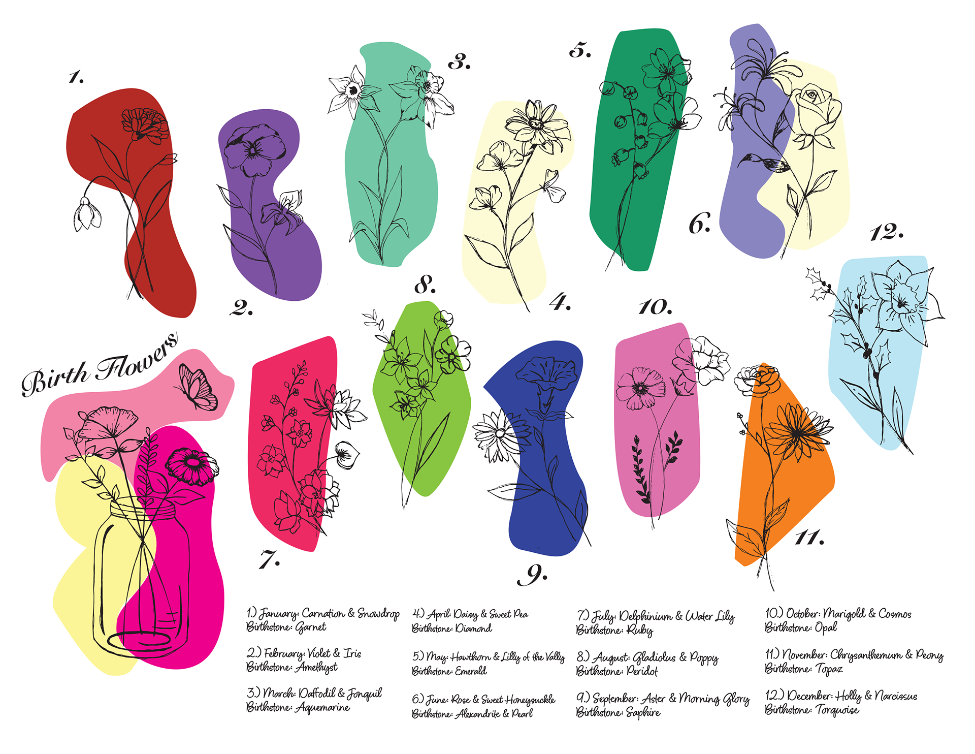 Collegiate project created throughout my undergraduate senior year, featuring hand-drawn birth flowers for each month paired with the colors of their corresponding birthstones. Designed using Adobe Illustrator, Adobe Photoshop, and Procreate.
