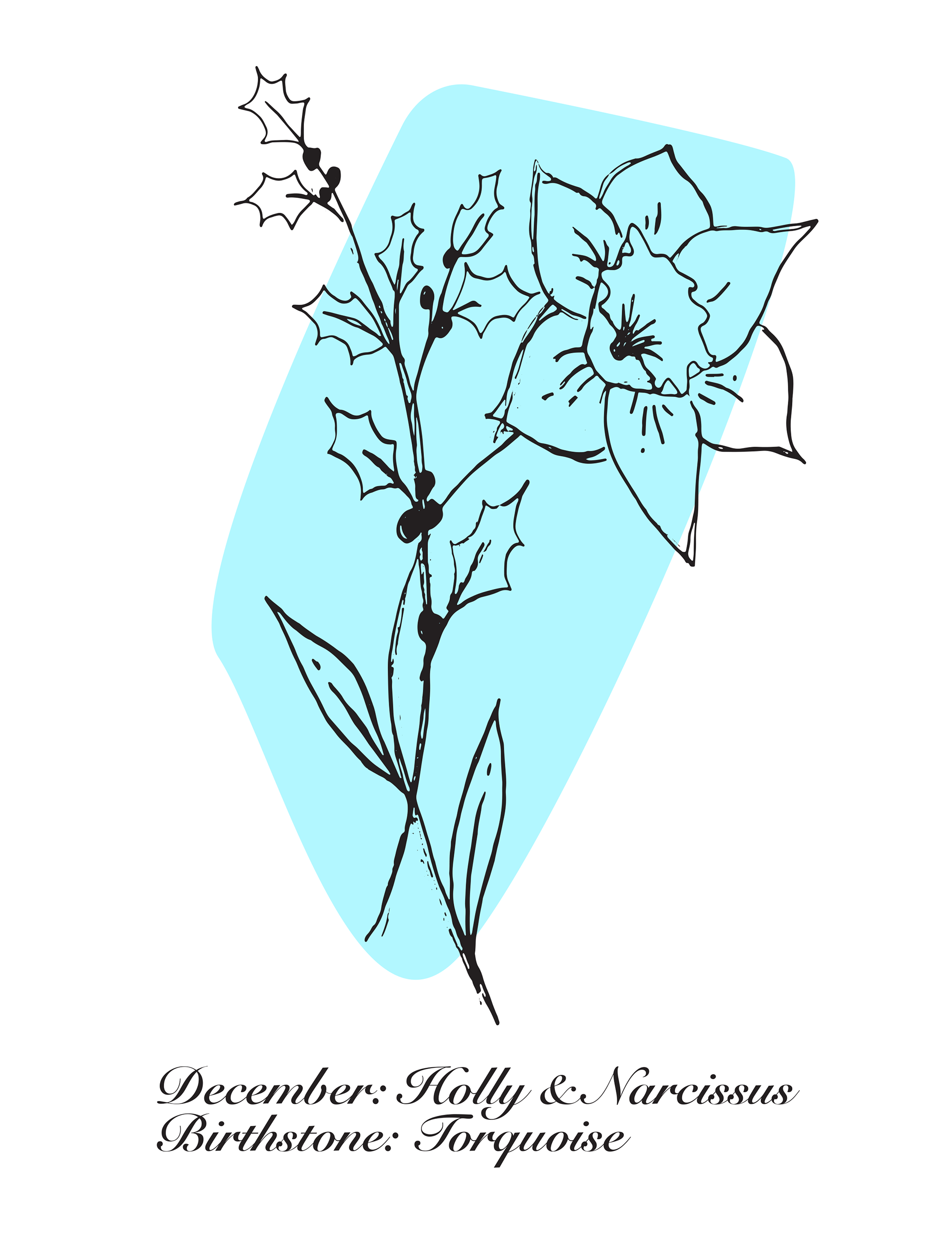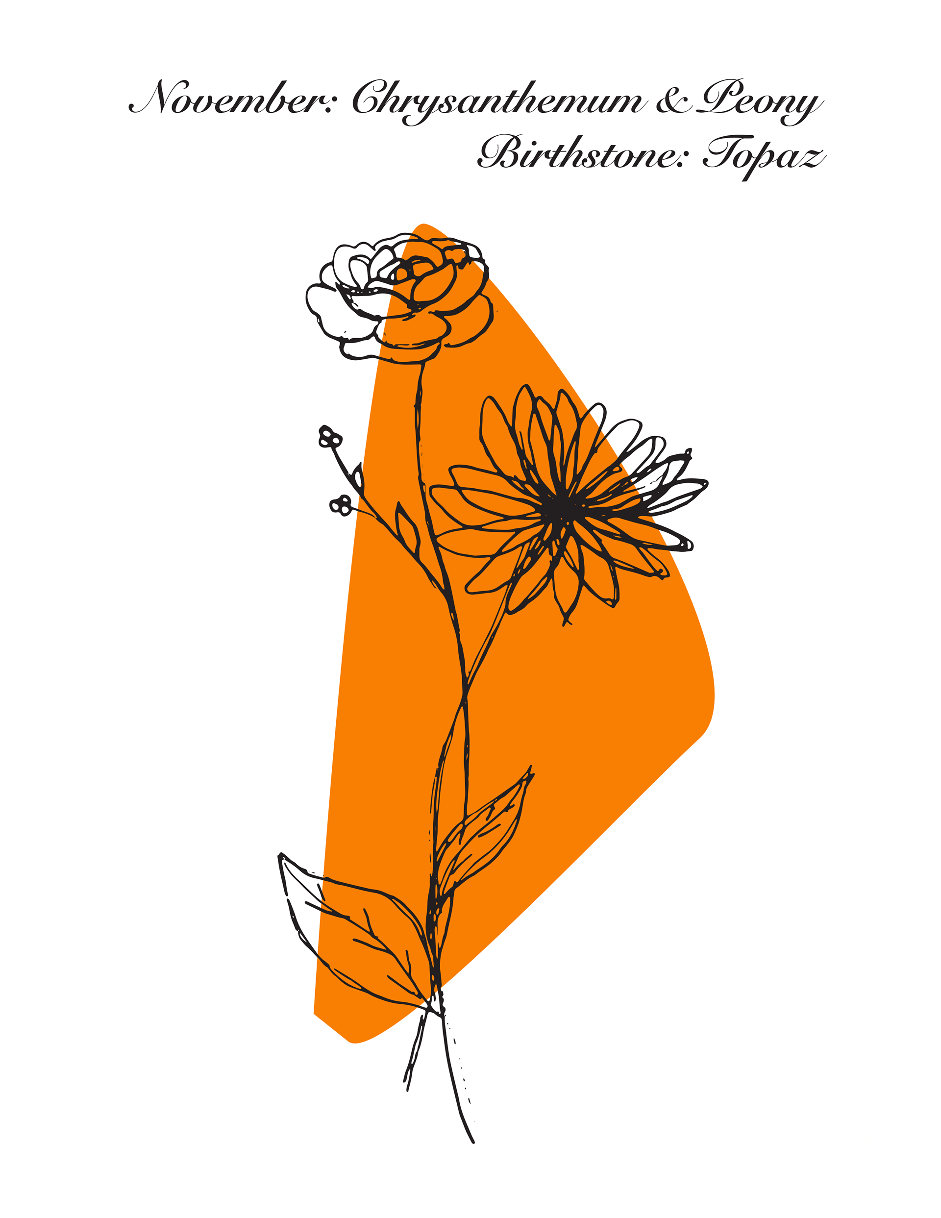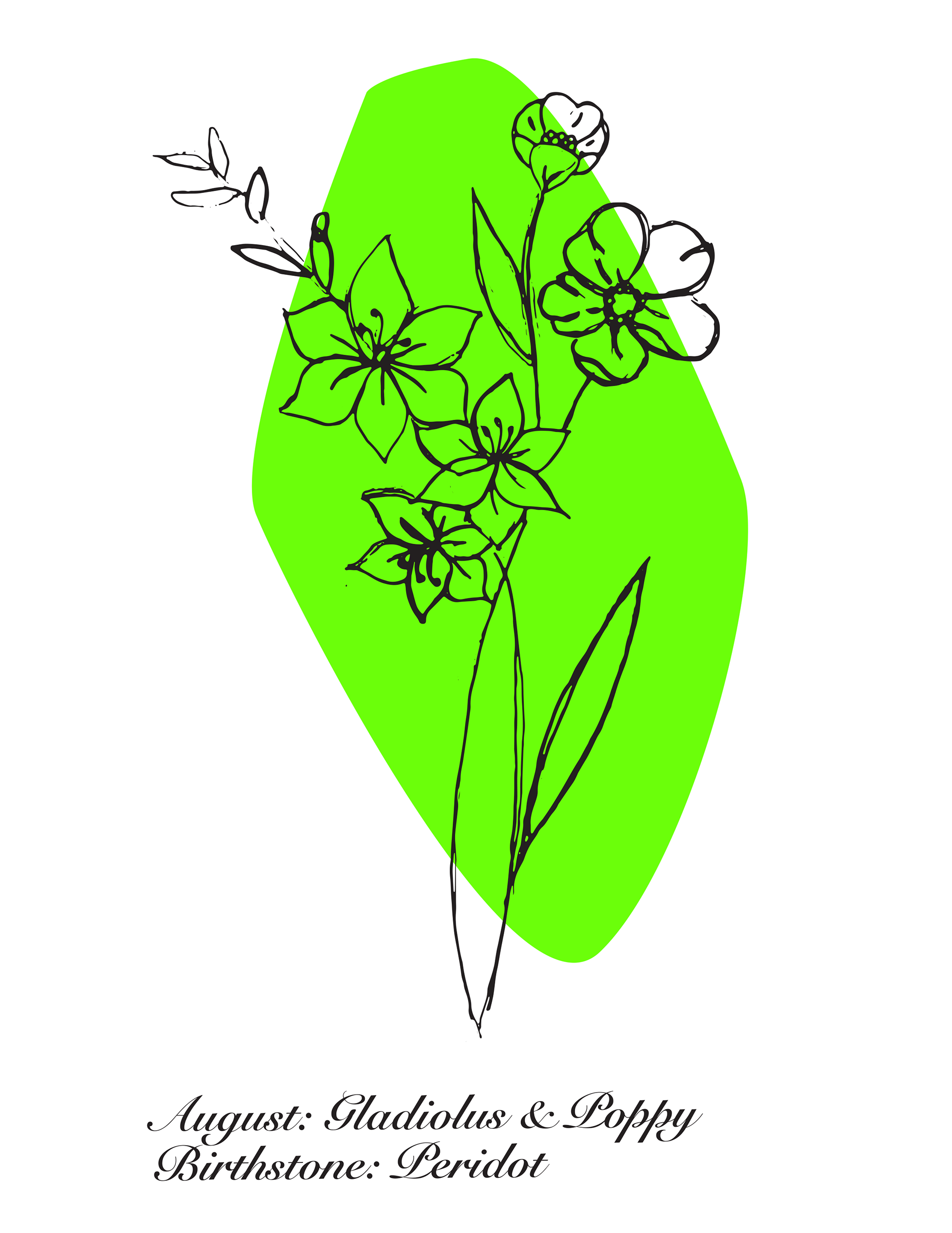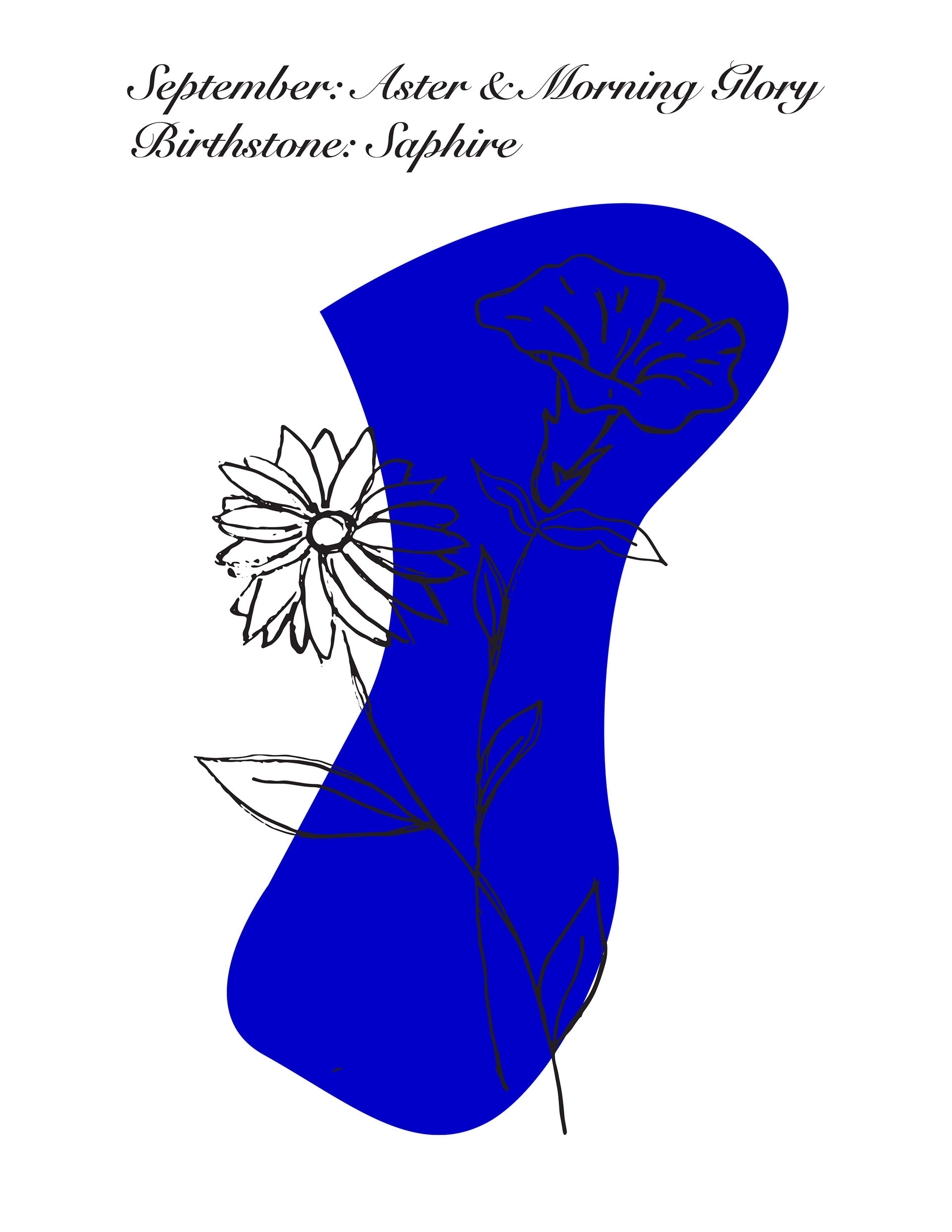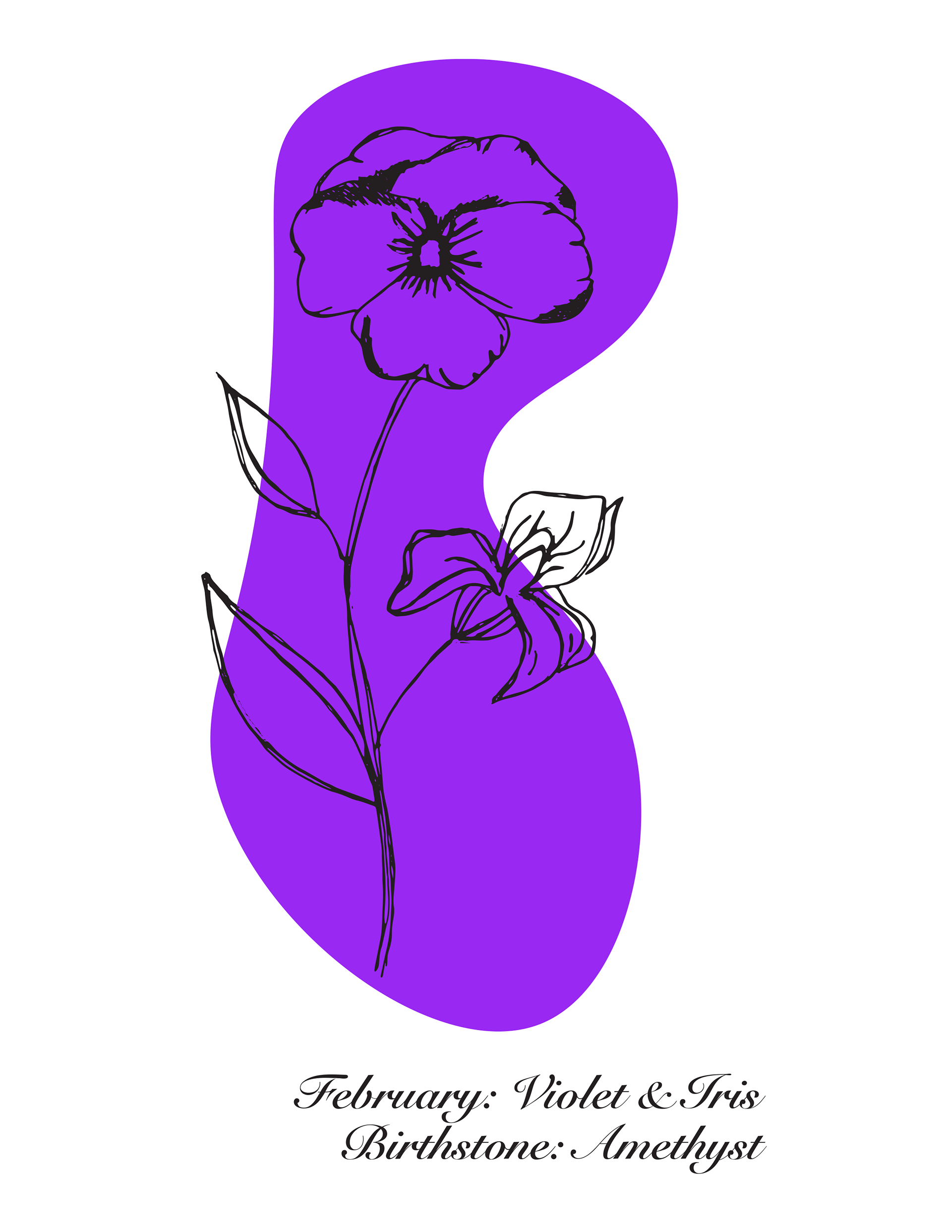 Collegiate project created throughout my undergraduate senior year, featuring hand-drawn birth flowers for each month paired with the colors of their corresponding birthstones. Designed using Adobe Illustrator, Adobe Photoshop, and Procreate.